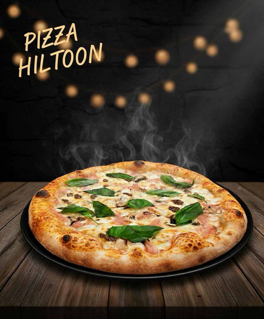 - Blat pizza, sos rosii, ulei masline, oregano, sunca, ciuperci