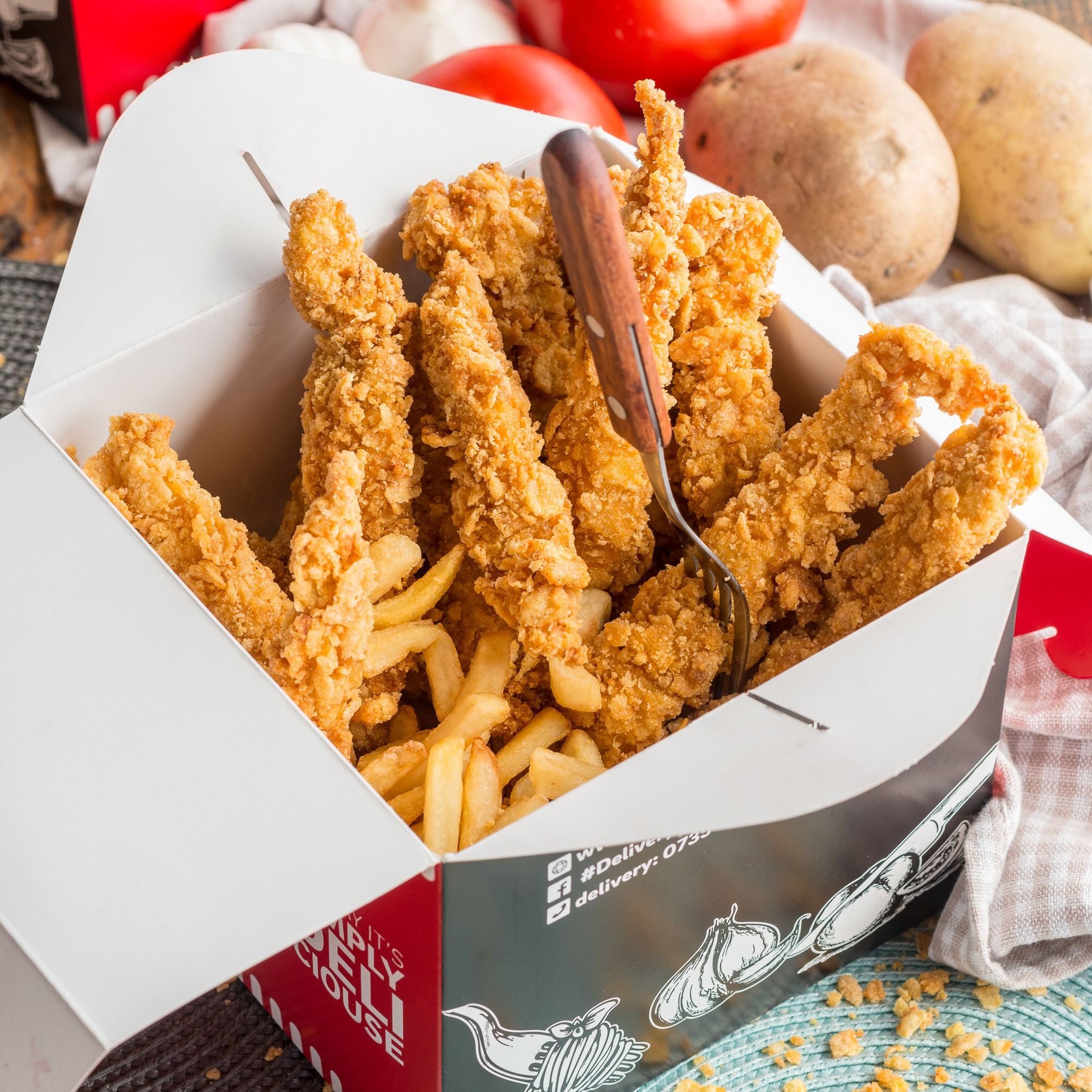 - piept de pui crispy 35 buc (1500g) , cartofi pai 1000g + sos