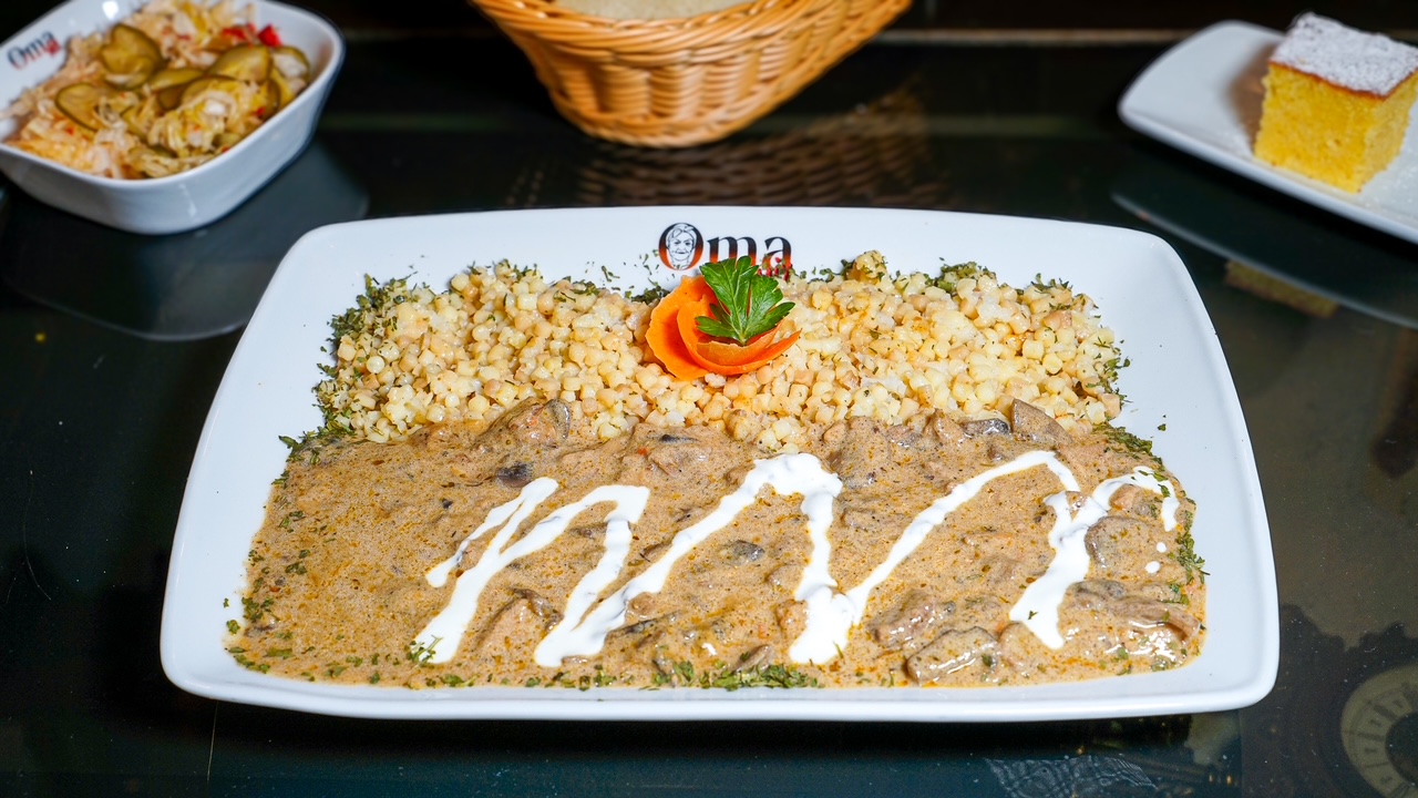 Tocăniță de Herány, garnitura la alegere: mămăligă sau cartofi țărănești sau cus-cus, muratura asortata, desert